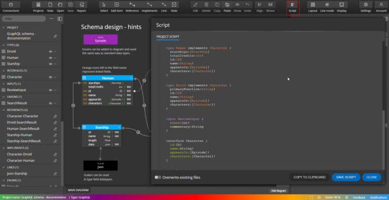 To generate scripts from your GraphQL project click the Script icon on the main toolbar. New modal opens. Click Save Script and select a location where the file should be stored. Option Overwrite existing files allows you to ignore existing scripts and overwrite them without getting a warning.